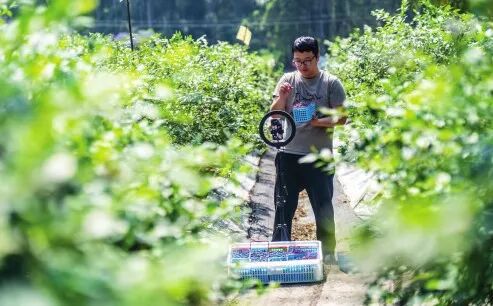 强化乡村经济发展的多点支撑带动,有助于催生城乡融合发展新动力。图为四川某村家庭农场,农场主正在直播销售蓝莓。